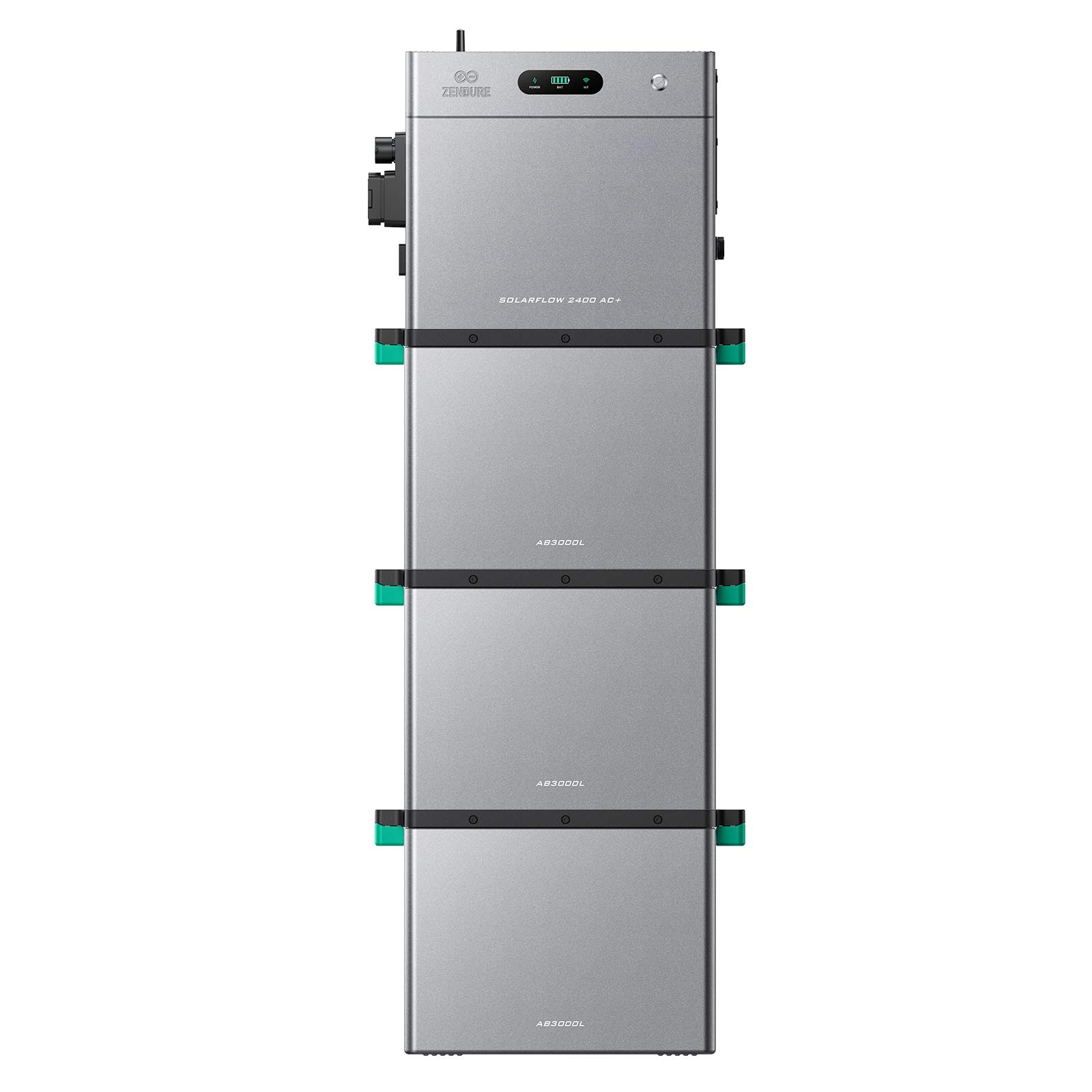 De SolarFlow 2400 AC+ is een all-in-one systeem. De hoofdunit omvat de omvormer en een opslagcapaciteit van 2,4 kWh. Extra batterijen (AB3000L) kunnen onder aan de stapel worden toegevoegd.